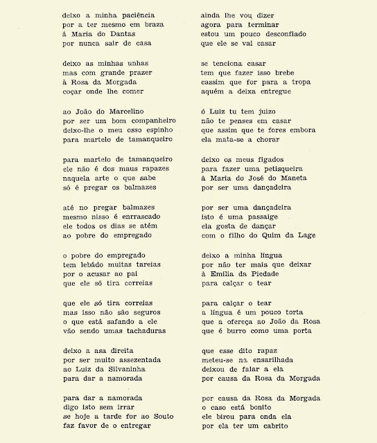 Aunque extenso, no me resisto a reproducir un texto copiado de un manuscrito por Carlos Lopes Cardoso en 1955 y publicado en Um 'testamento do galo' de Arcos de Valdevez (Revista Lusitana, Nº 4, 1982-83).